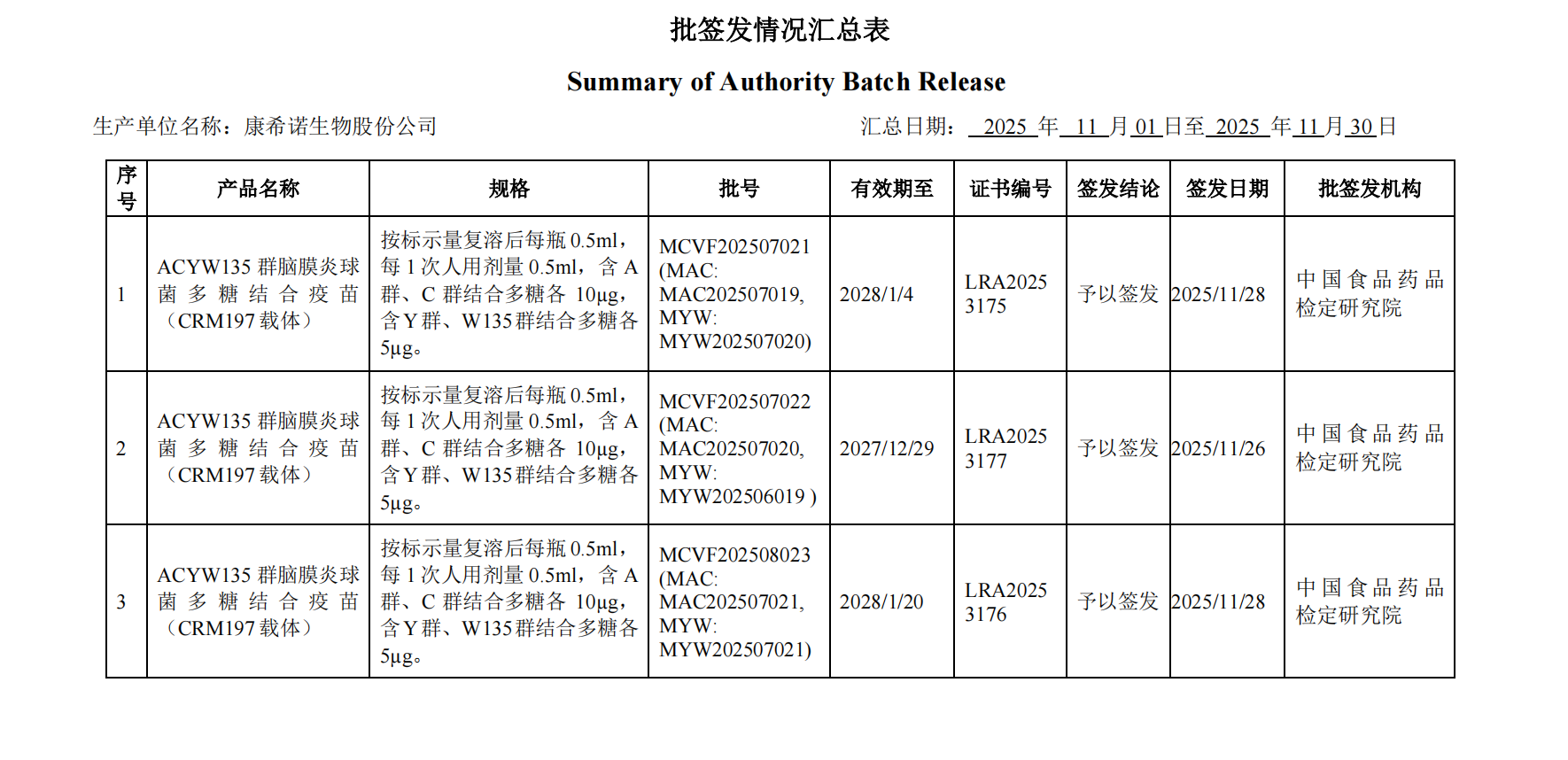 2025年11月份产品批签发信息